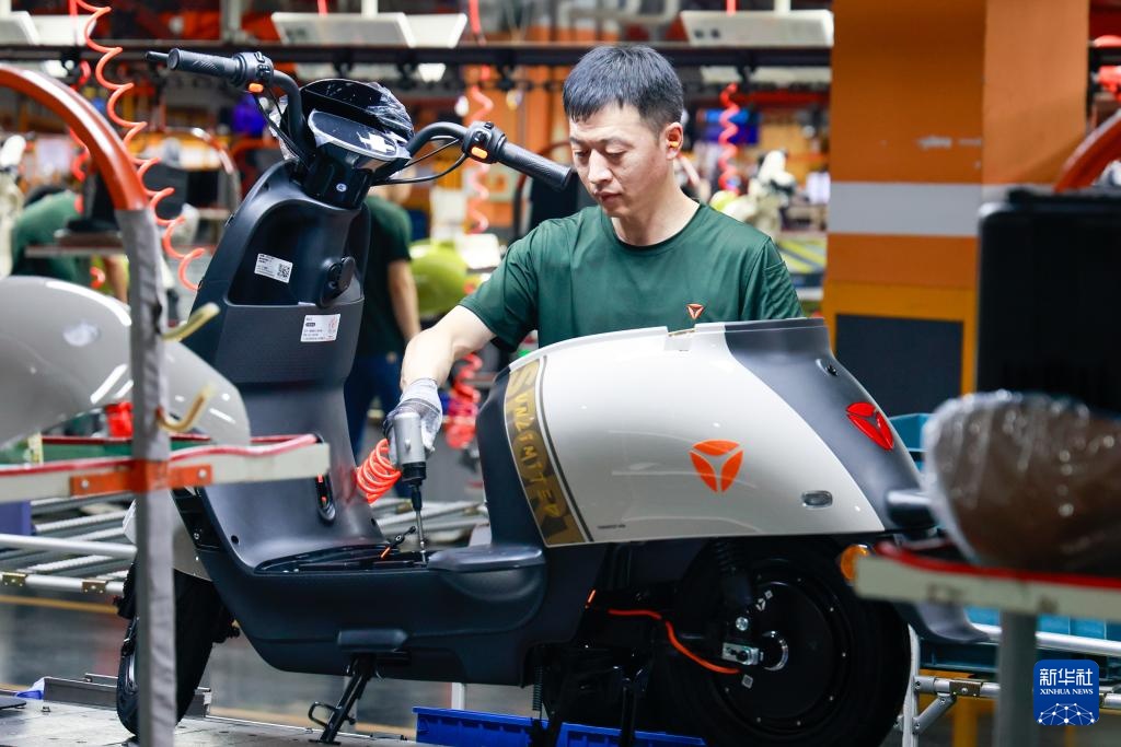 9月16日,在江苏无锡锡山区电动车工业园,作业人员在雅迪科技集团有限公司的电动车出产线上紧固装置脚踏板。新华社记者 刘佳琪 摄