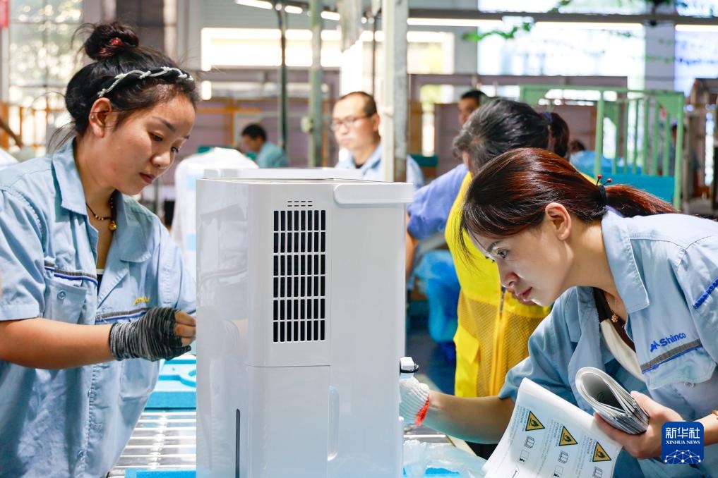 9月17日,在江苏常州友奥智能科技股份有限公司,作业人员在出产车间给除湿机机身贴标。新华社记者 刘佳琪 摄
